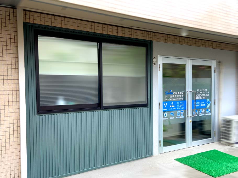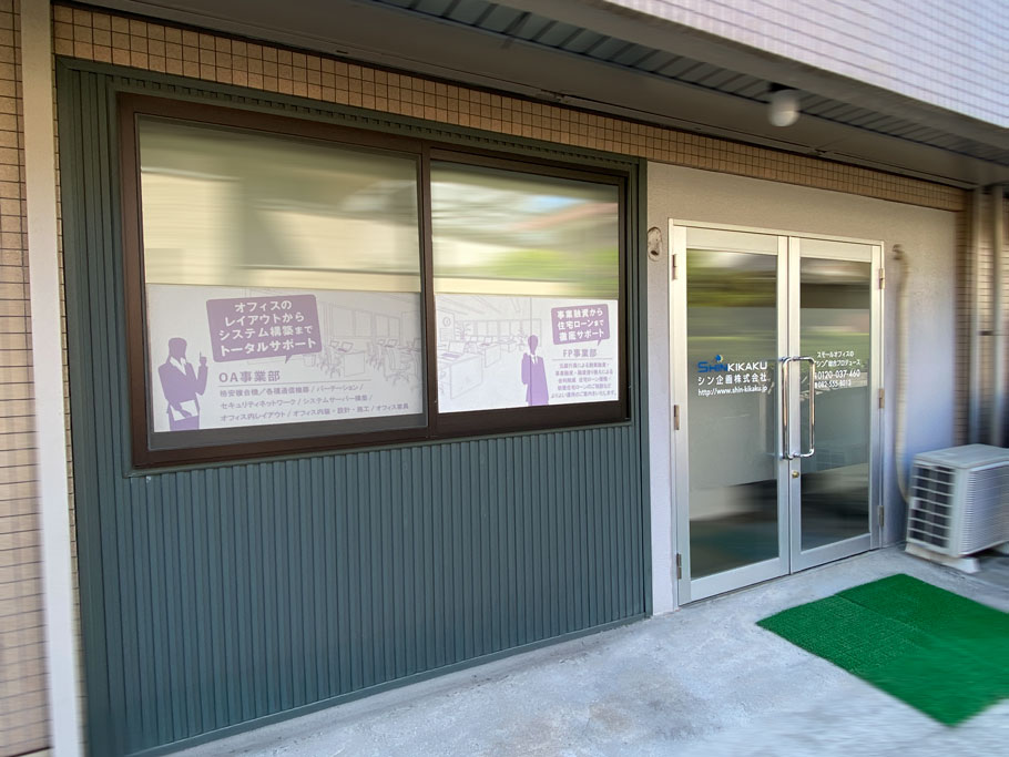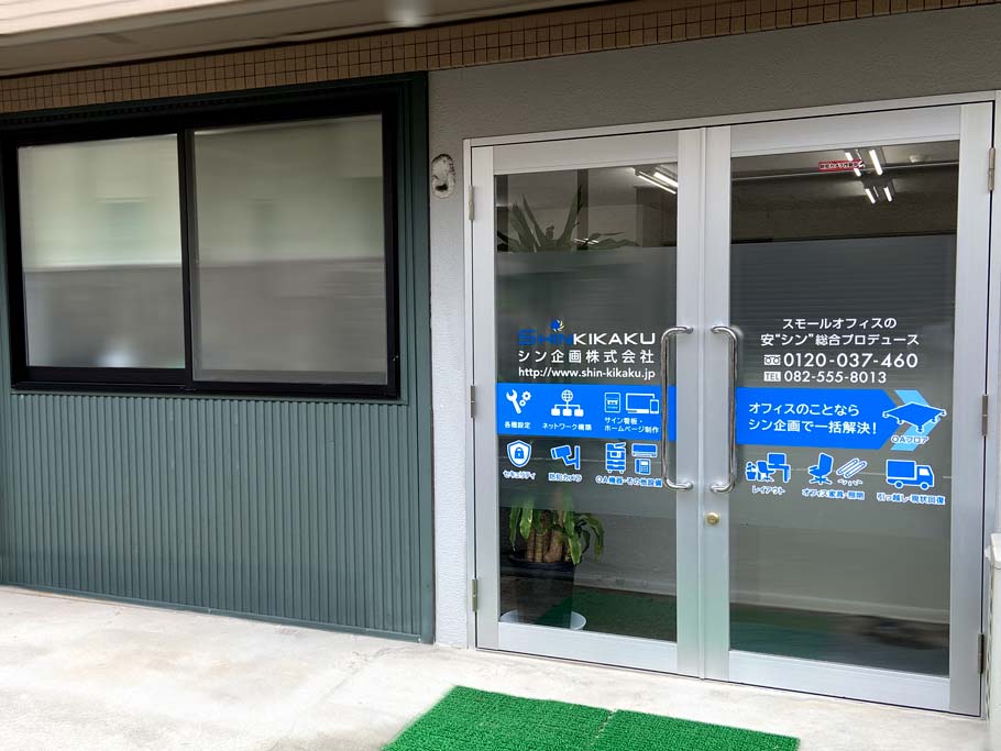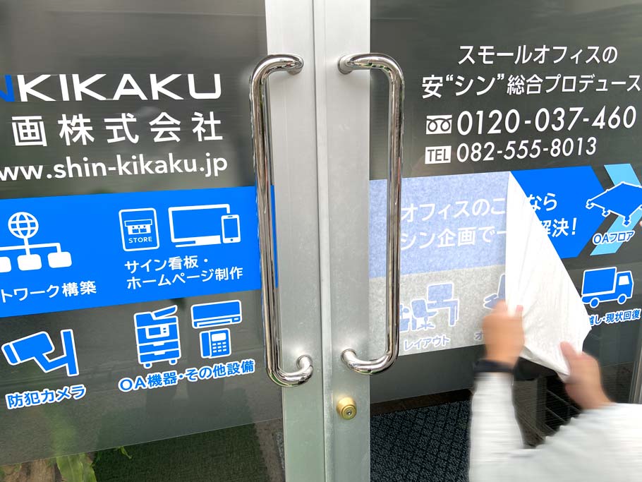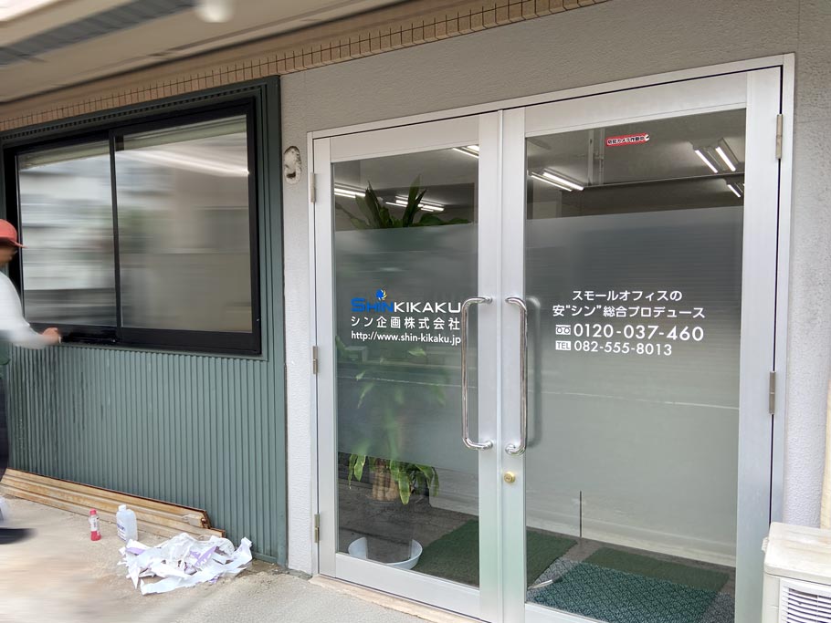 「シン企画の事業内容を、お客様目線で伝わりやすくしたい。」という想いから、シン企画のエントランスにあたる玄関ドアと窓のカッティングシート貼り替え施工を行うこととなりました。