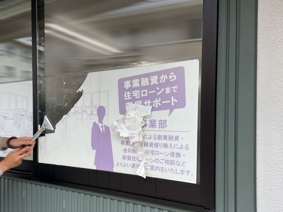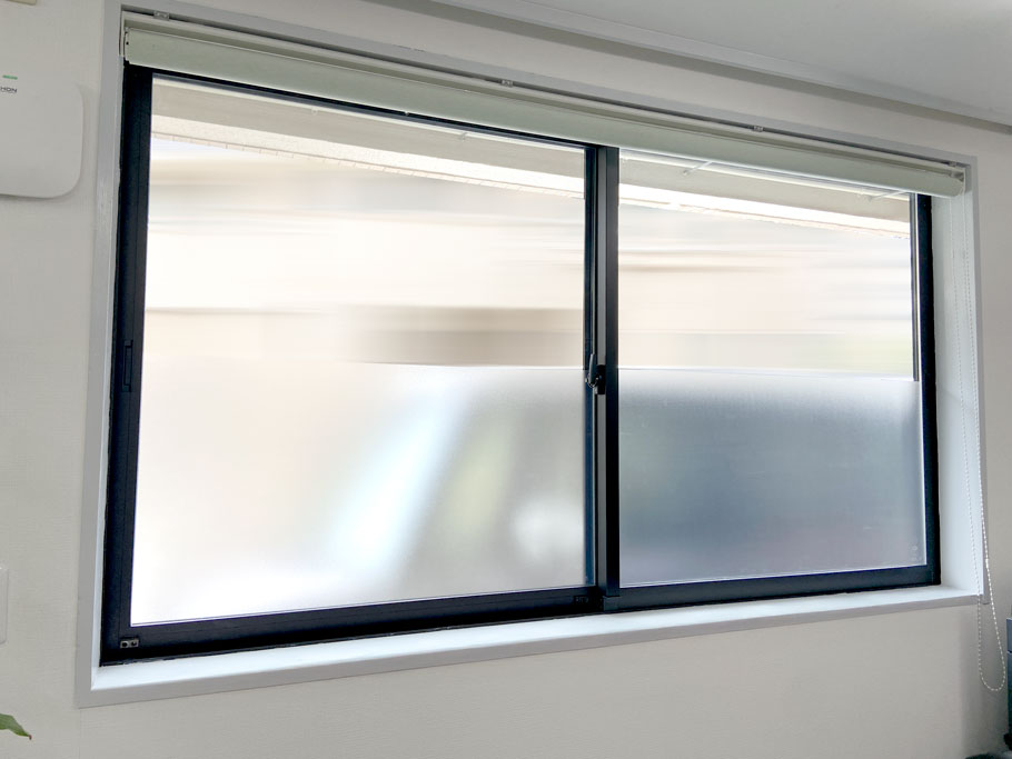 施工前の状態です。窓には既存のシートが貼ってあるため、剥がしてからプライバシー保護のためのスリガラスシートを新しく貼り付けます。