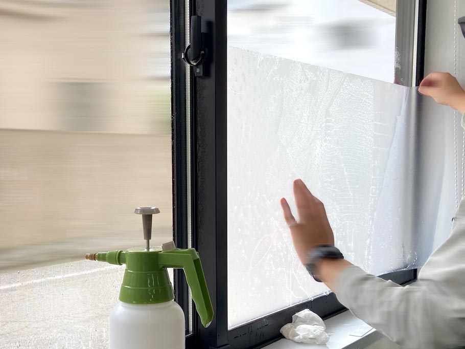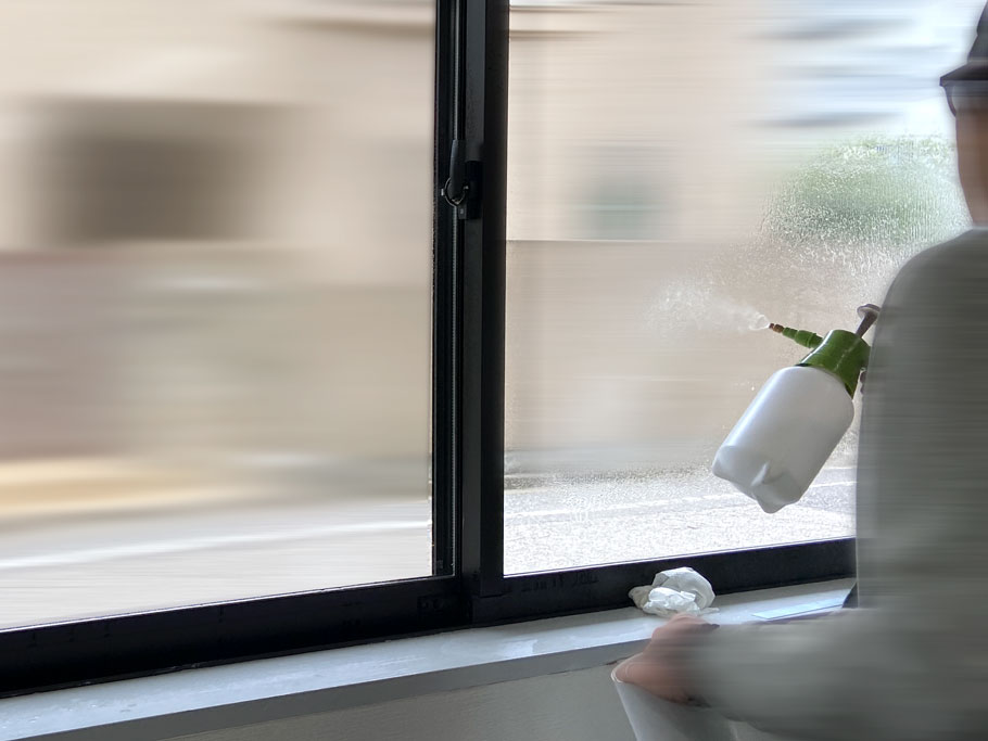 窓に吹き付けているのは洗剤を溶かした水溶液です。糊だけだとくっつきすぎてしまうため、洗剤を吹き付けることで丁度よく貼り付きます。