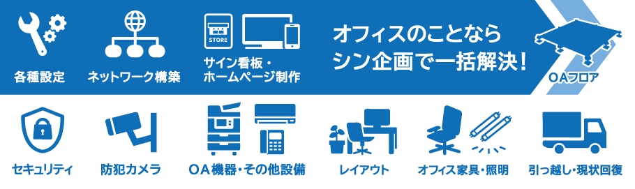 オフィスのお悩みを包括的に解決するシン企画の事業内容が一目で伝わるようにシートのデザインを作成しました。